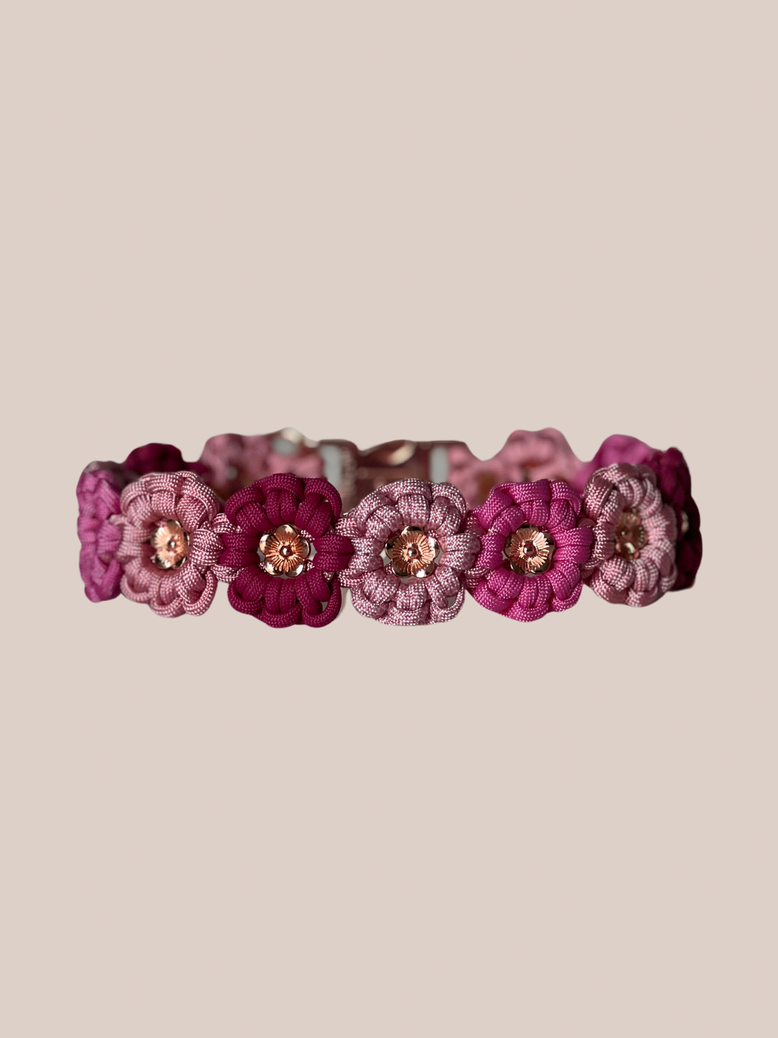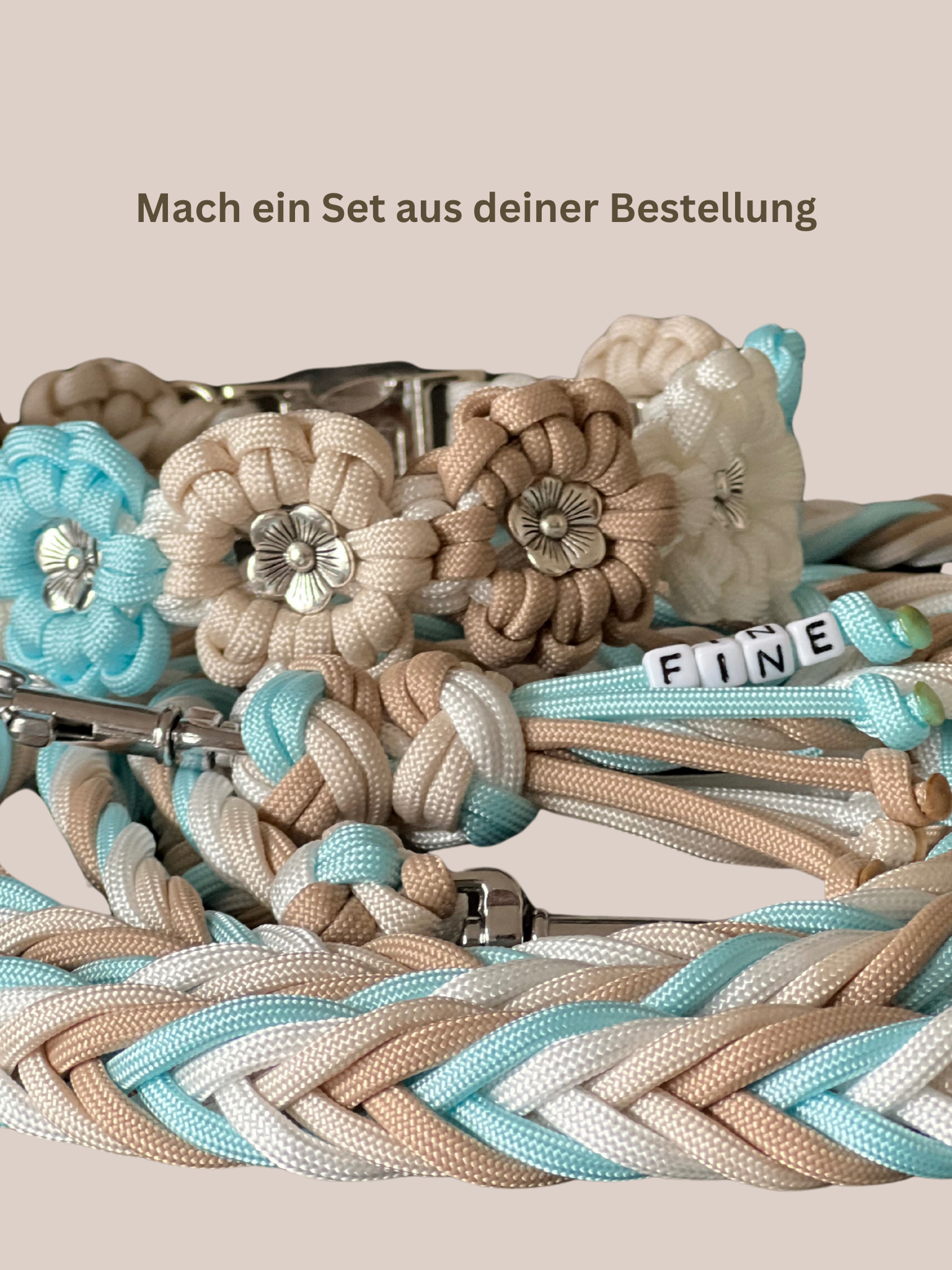 Jedes Halsband wird individuell von Hand gefertigt, sodass du die Möglichkeit hast, maximal vier Farben selbst auszuwählen und zu kombinieren. Dadurch erhält dein Hund ein Halsband, das seinen ganz persönlichen Stil widerspiegelt. Wir stellen sicher, dass jede Farbzusammenstellung ein einzigartiges Kunstwerk darstellt. Die Metallblumen sind in der gleichen Farbe wie die ausgewählte Verschlussfarbe.