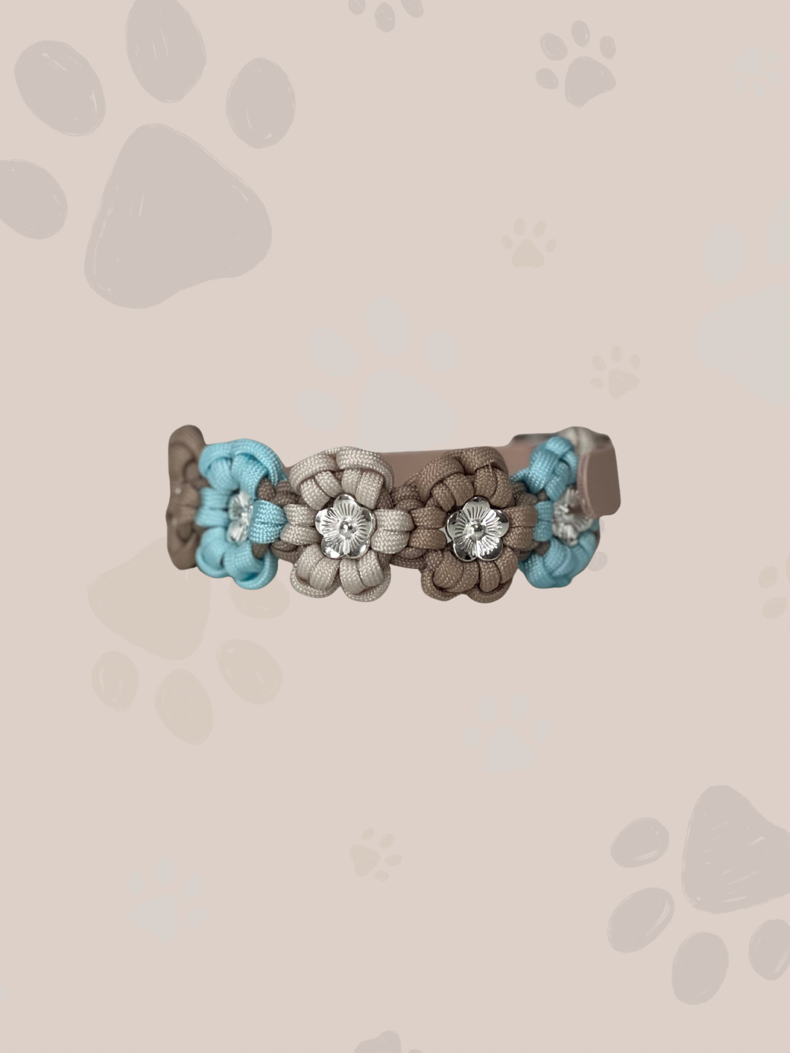 Jedes Halsband wird individuell von Hand gefertigt, sodass du die Möglichkeit hast, maximal vier Farben selbst auszuwählen und zu kombinieren. Dadurch erhält dein Hund ein Halsband, das seinen ganz persönlichen Stil widerspiegelt. Wir stellen sicher, dass jede Farbzusammenstellung ein einzigartiges Kunstwerk darstellt. Die Metallblumen sind in der gleichen Farbe wie die ausgewählte Verschlussfarbe.